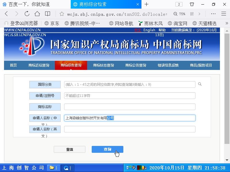 第二步、输入 上海奇峰创智科技开发有限公司的名称